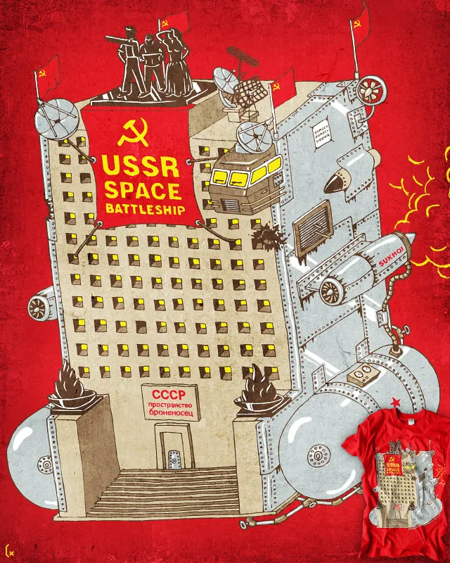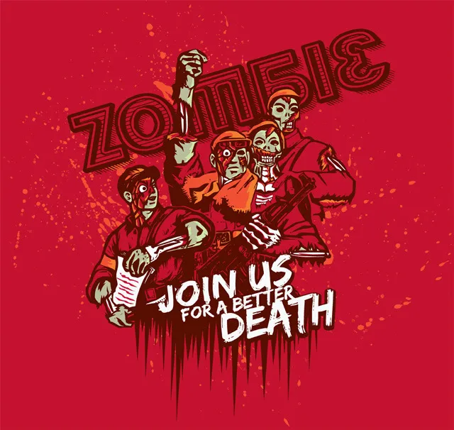 Пролетариат бессмертен, — доказывает нам этот принт для футболки, на котором доблестные борцы за умерщвление с оранжевым шарфом, калашниковым и манифестом нежити в полуразложившейся конечности призывают в свои ряды. Новичкам выдают стильные кепи строителей мрачного будущего, заслуженным зомбакам положены каски истребителей-стахановцев.