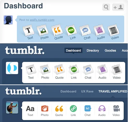 Сегодня поменялись главные кнопки, на которые каждый день нажимают миллионы человеческих существ. И вот как выглядит эволюция панели действий в тамблере. (thx uxrave)