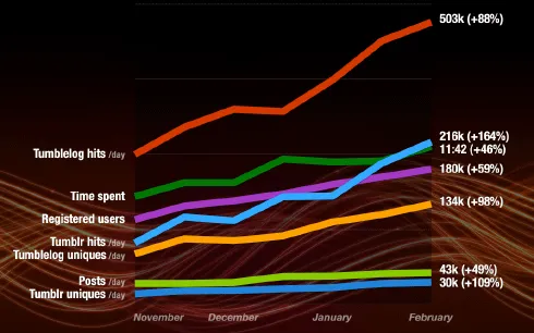This Silicon Alley Insider article discusses Tumblr’s recent growth. It’s currently getting over 700,000 page views per day, more than 2/3 of which go to actual tumblelogs. The rest are to the Tumblr homepage, the Dashboard, and other non-tumblelog pages. I probably check my Dashboard 20 times a day; there are no other sites I check regularly except Gmail and Kottke.